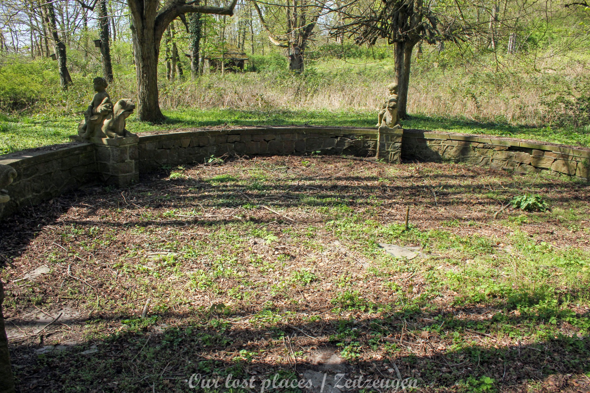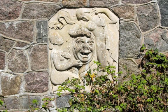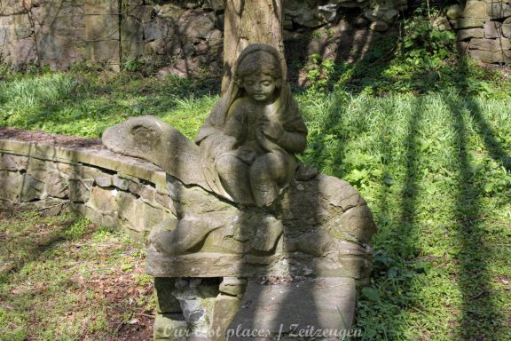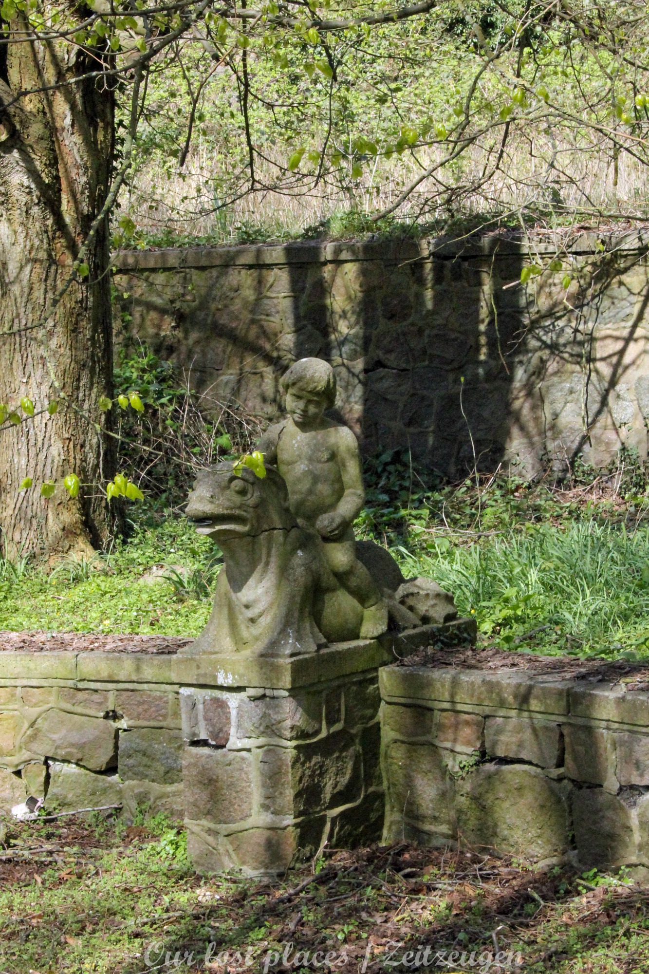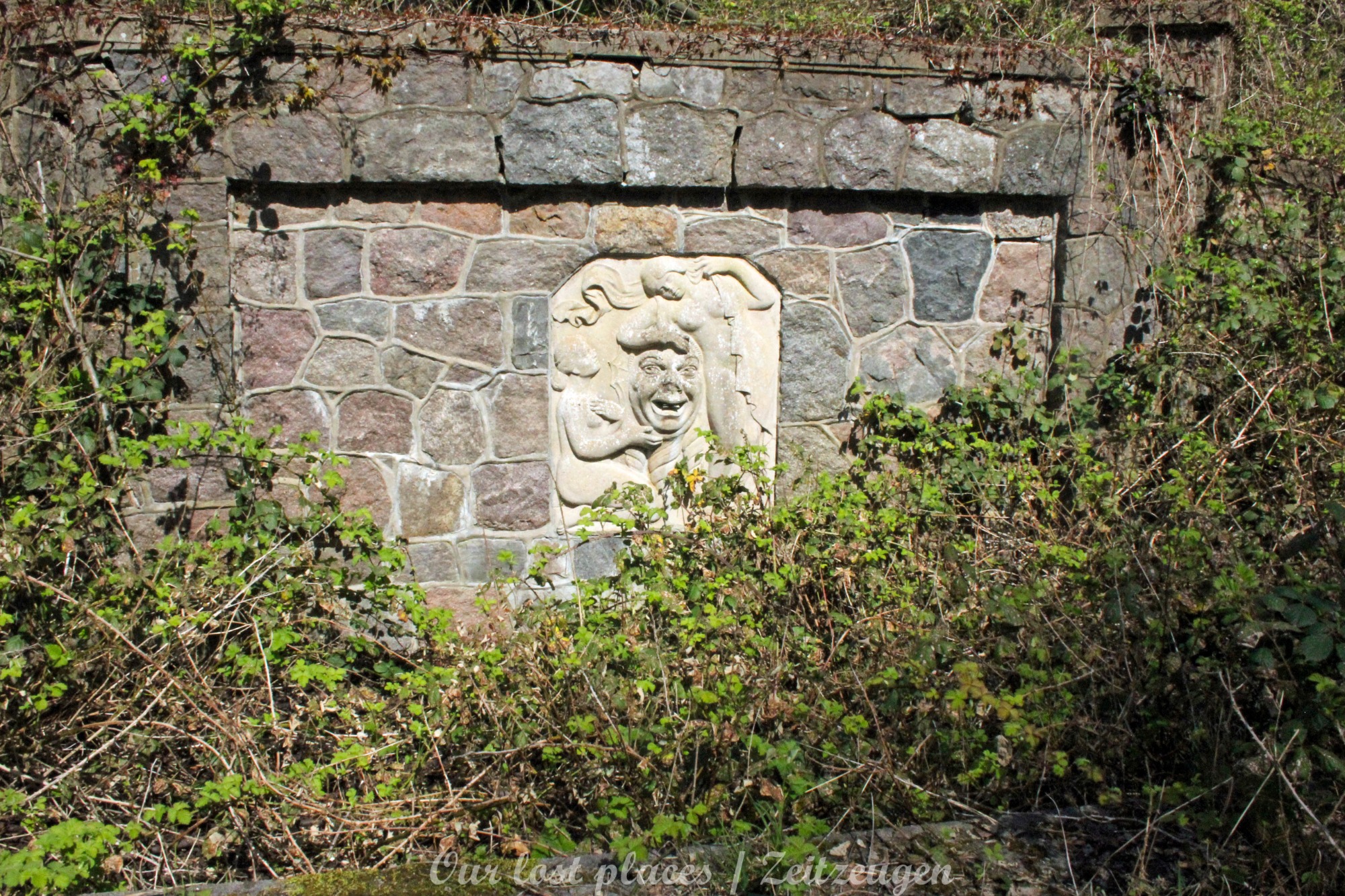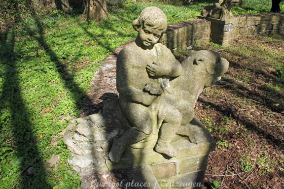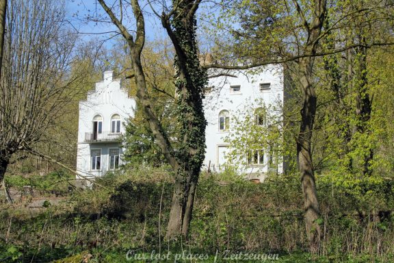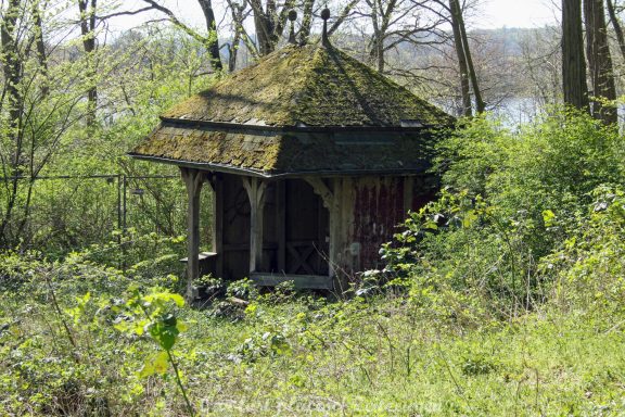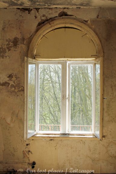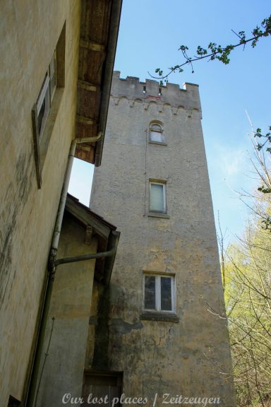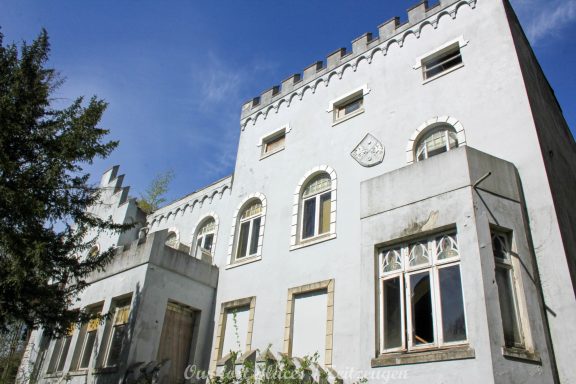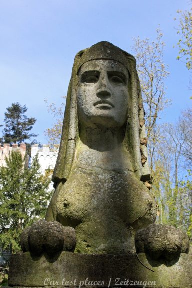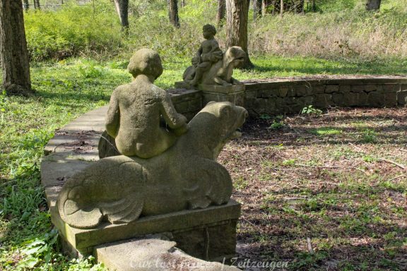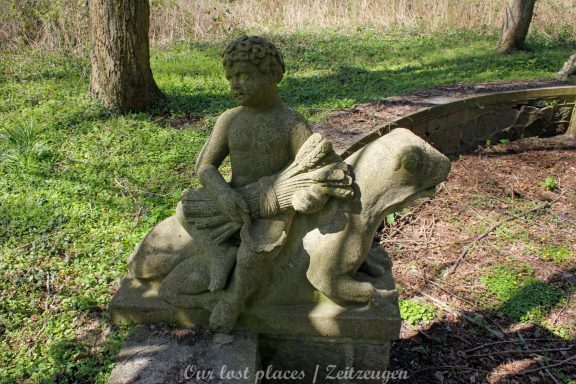 Man muss schon etwas suchen, da das Objekt nicht gerade auf dem Präsentierteller liegt. Gut versteckt in einem ehemaligen Park, der mittlerweile sehr stark zugewuchert ist. Im Sommer machen sich Brombeeren breit (die Freunde jedes Fotografen) und die Bäume sind stark Efeuberankt. Das vermeidliche Schloss ist gar kein Schloss, sondern eine umgebaute Bauernkarte die im 19 Jhs. errichtet wurde. Zu Beginn des 20 Jhs. erwarb ein Berliner Kaufmann, der in den Adelsstand erhoben wurde, mit wenig architektonischem Gespür. Er ließ die Bauernkarte erweitern und zu einem Möchtegern- Prunkschloss umbauen. Schließlich wollte man als Adliger ja auch standesgemäß wohnen. Das Ursprungshaus wurde mit Erkern, Vorbauten, Zinnen und einem Burg ähnlichen Turm versehen. In dem ehemaligen Dorf wurde von den Einheimischen nur noch von dem „Schloss“ gesprochen. Erst ein Besitzerwechsel brachte etwas Ästhetik in das Anwesen. Es wurde ein umfangreicher Park gestaltet. Vor dem Haus wurde mit mehreren Mauern ein terrassenähnlicher Aufbau gestaltet. Davor wurde ein großer Brunnen mit vielen Figuren errichtet, aus denen früher Wasser floss. Es gab sogar eine Allee, die vom Haus bis zum angrenzenden See führte. Das Haus steht seit Jahrzehnten leer und wird dadurch nicht besser.