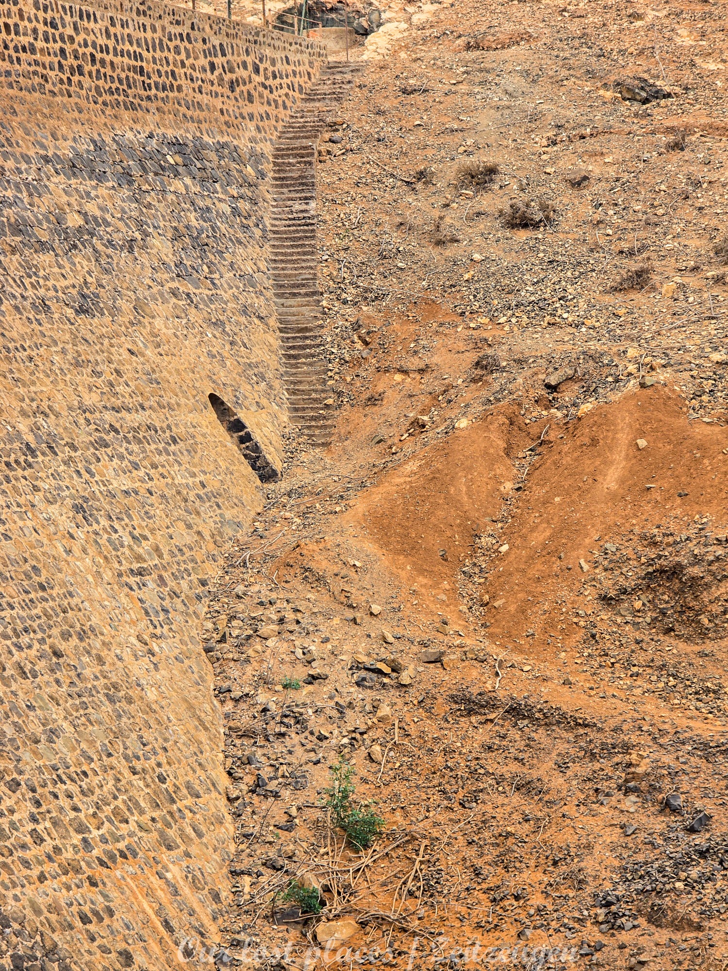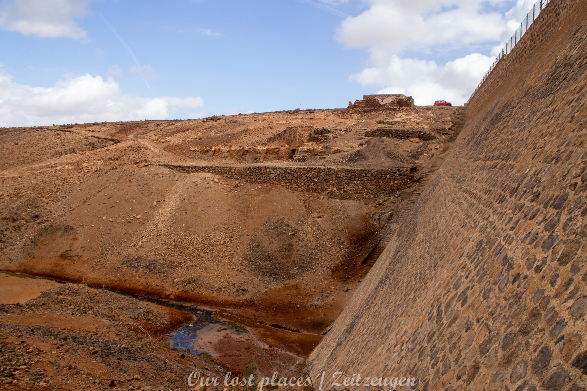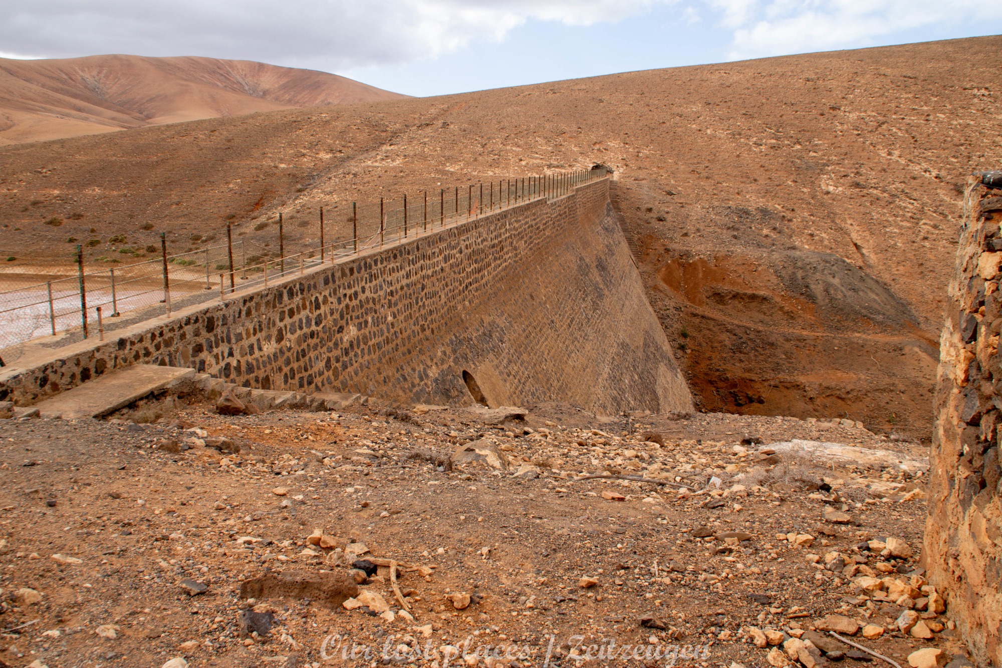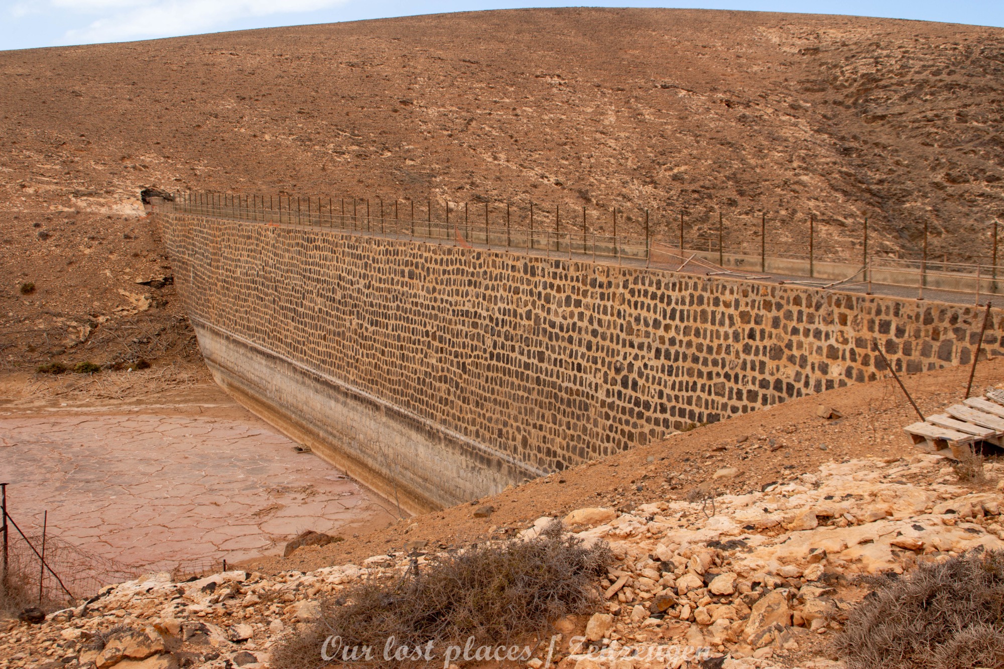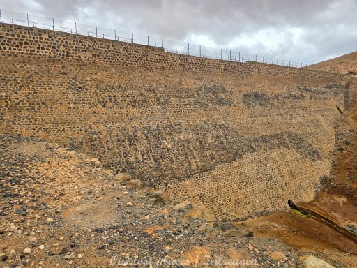 Der Bau des Staudamms ist auf die damalige Franco Diktatur zurückzuführen. Diktator Franco besuchte die Insel 1950 persönlich und versprach sie wieder wirtschaftlich aufblühen zu lassen. In einer Entfernung von ca. 3 bis 4 Kilometern vom Staudamm wurde damals eine landwirtschaftliche Kolonie errichtet. Dort sollten Linientreue am Aufschwung arbeiten. Den Ort gibt es heute noch mit einer Hand voll Häusern. Politisch Verfolgte wurden damals hier in Straflager untergebracht und als Arbeitskräfte eingesetzt. Drunter vielen unliebsame Regimegegner, Homosexuelle und Landstreicher. Sie wurden in Baracken untergebracht, von denen man heute noch teilweise Reste findet. Bis zu 1500 Menschen waren hier untergebracht. Das Leben war hier hart gearbeitet wurde jeden Tag außer Sonntag. Waschen durften sich die Gefangenen nur am Samstag. Wasser wurde aus dem großen Becken geholt, welches sich vor der Staumauer gebildet hat. Das Straflager war von 1956 bis 1966 in Betrieb. Interessanterweise war das Gelände damals nicht eingezäunt. Wer floh, verdurstete und verhungerte irgendwo auf der Insel. Man hüllt sich heute noch in Schweigen, wie viele beim Bau des Staudamms umkamen.
