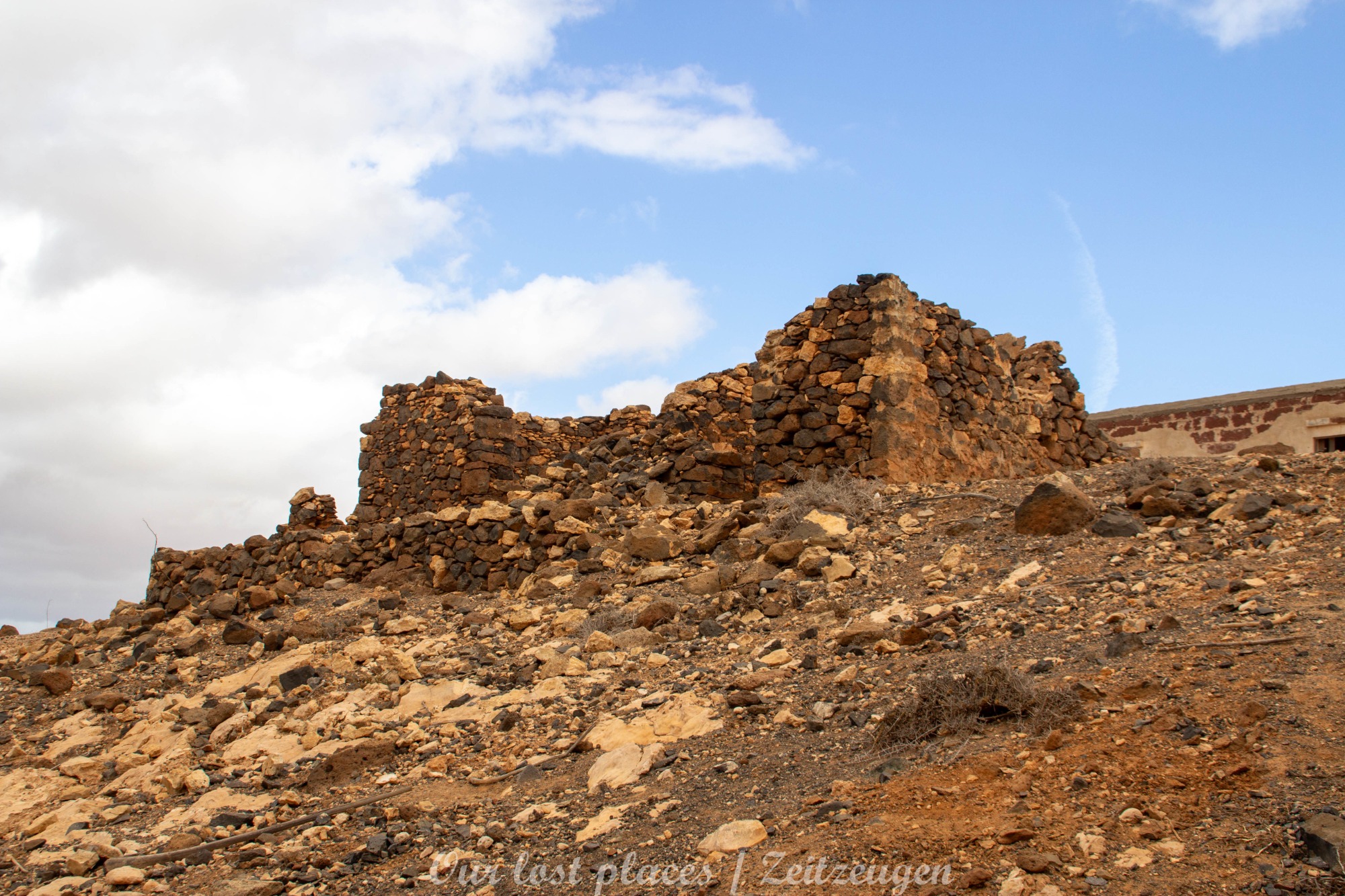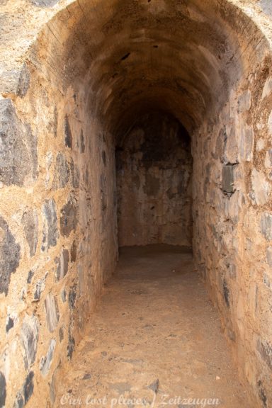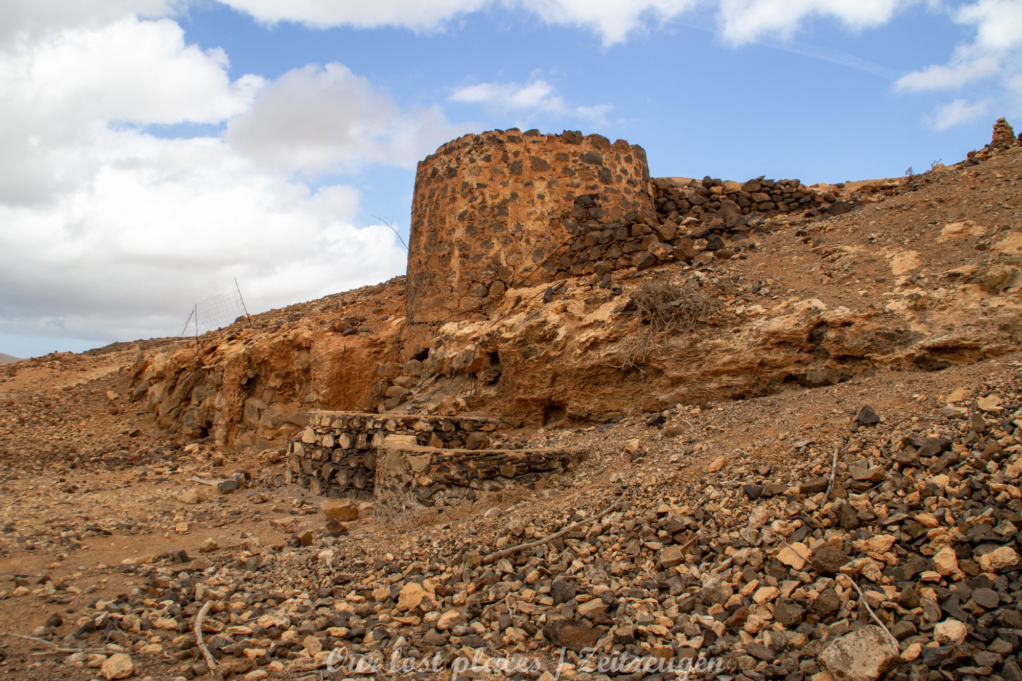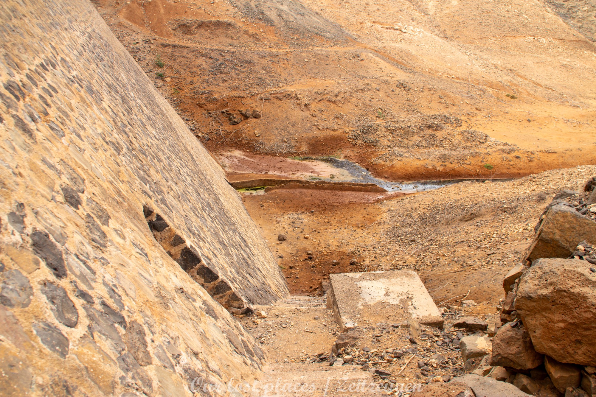 Der Bau des Staudamms ist auf die damalige Franco Diktatur zurückzuführen. Diktator Franco besuchte die Insel 1950 persönlich und versprach sie wieder wirtschaftlich aufblühen zu lassen. In einer Entfernung von ca. 3 bis 4 Kilometern vom Staudamm wurde damals eine landwirtschaftliche Kolonie errichtet. Dort sollten Linientreue am Aufschwung arbeiten. Den Ort gibt es heute noch mit einer Hand voll Häusern. Politisch Verfolgte wurden damals hier in Straflager untergebracht und als Arbeitskräfte eingesetzt. Drunter vielen unliebsame Regimegegner, Homosexuelle und Landstreicher. Sie wurden in Baracken untergebracht, von denen man heute noch teilweise Reste findet. Bis zu 1500 Menschen waren hier untergebracht. Das Leben war hier hart gearbeitet wurde jeden Tag außer Sonntag. Waschen durften sich die Gefangenen nur am Samstag. Wasser wurde aus dem großen Becken geholt, welches sich vor der Staumauer gebildet hat. Das Straflager war von 1956 bis 1966 in Betrieb. Interessanterweise war das Gelände damals nicht eingezäunt. Wer floh, verdurstete und verhungerte irgendwo auf der Insel. Man hüllt sich heute noch in Schweigen, wie viele beim Bau des Staudamms umkamen.