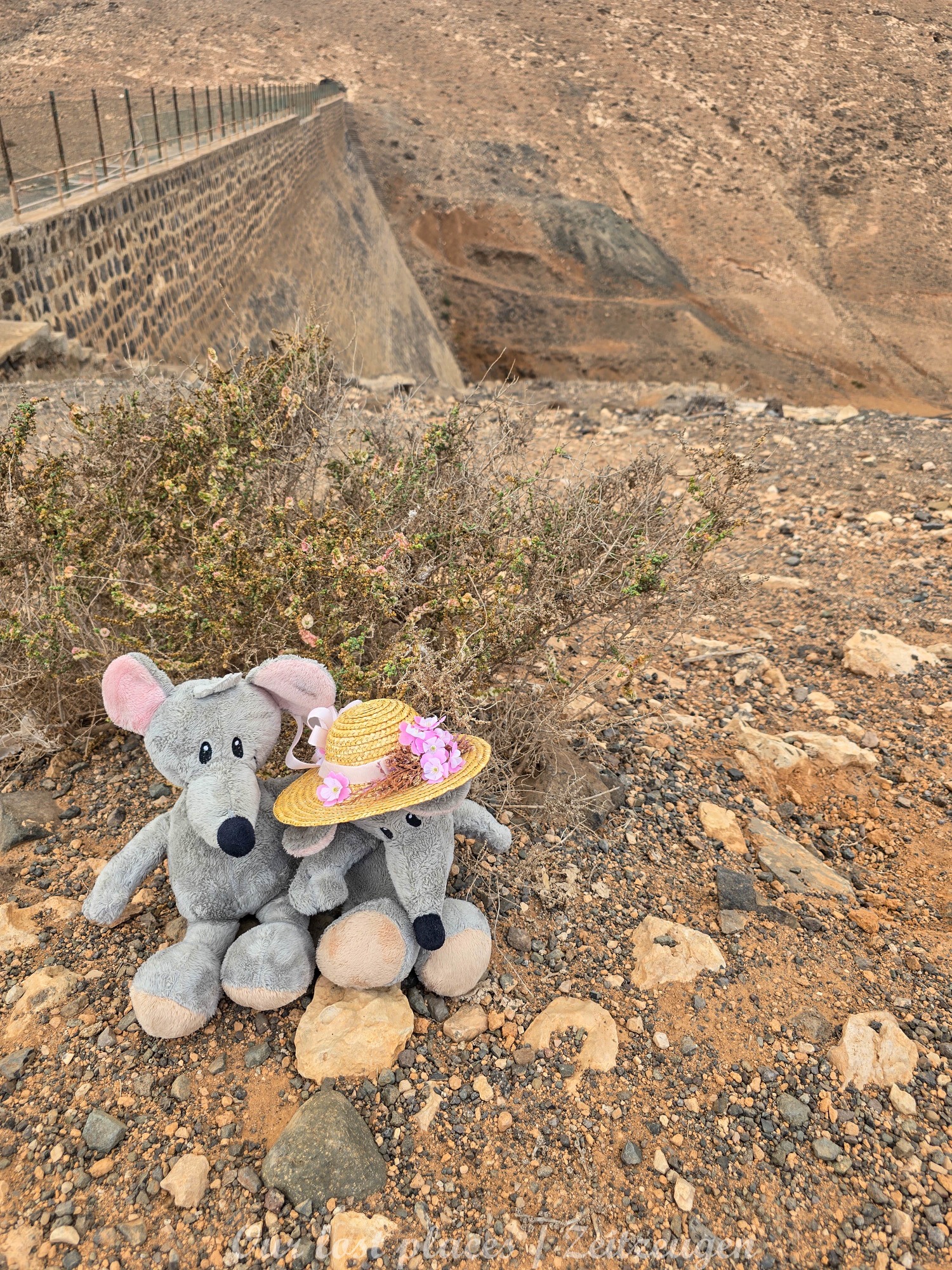 Man fühlte sich hier in der Gegend wie auf dem Mars. Ringsherum nur rötlicher Sand und Gestein. Kilometerweit kein weiteres Leben. Aber bekanntlich macht Mars ja mobil und so sind unsere beiden kleinen Freunde mit ihrem Jeep direkt ins nichts gefahren um neue Orte und Abenteuer zu finden. Ausgestattet mit viel Sonnencrem und reichlich Getränken ging es lange Schotterpisten lang bis sie ihr Ziel erreicht haben. Einen alten Staudamm, der wirklich im Nichts steht. Außer einer Horde wilder Atlashörnchen, die mal vorbeischauten ob ein paar Nüsse für die rausspringen 😊