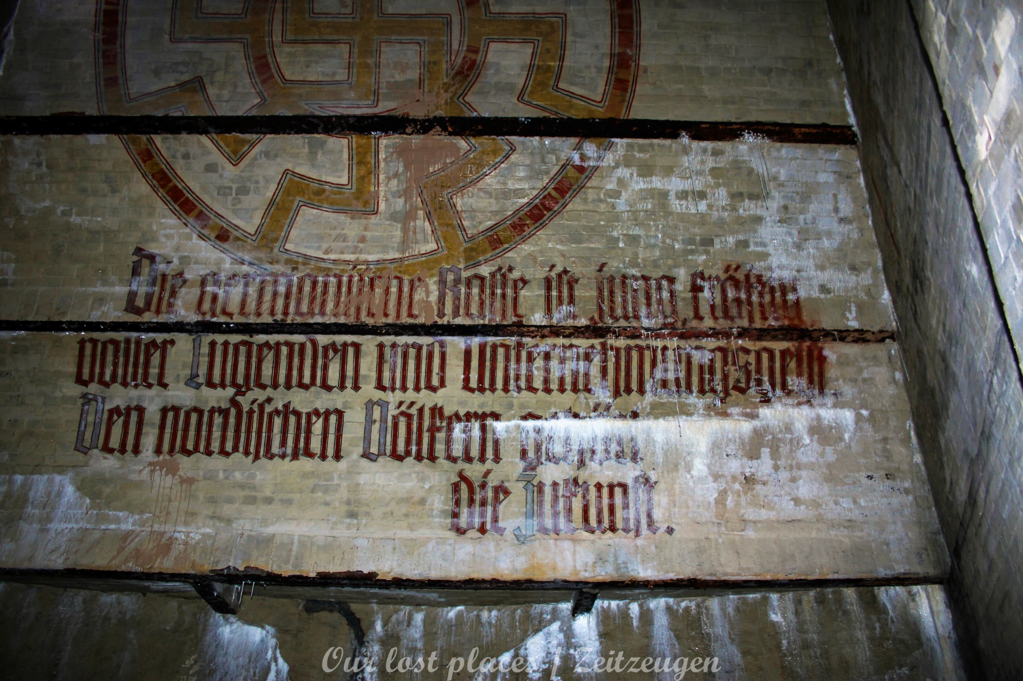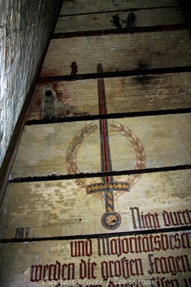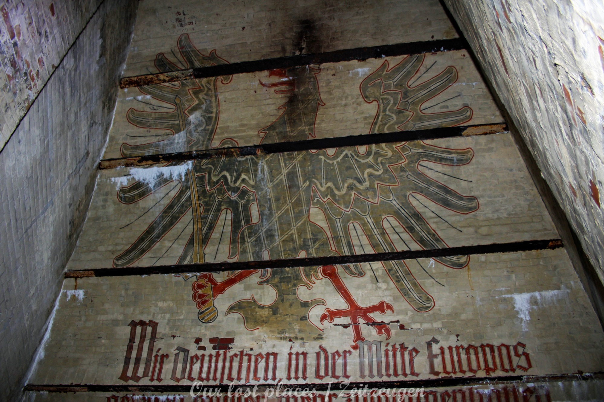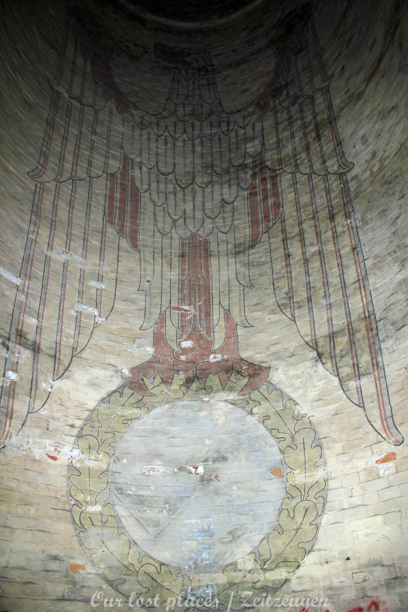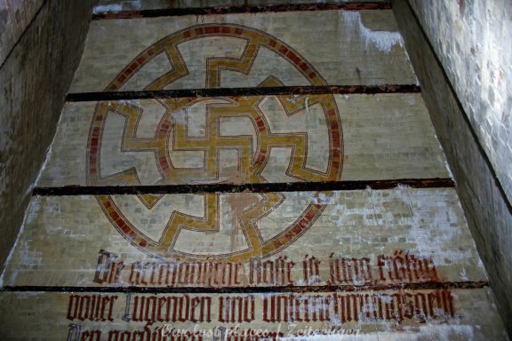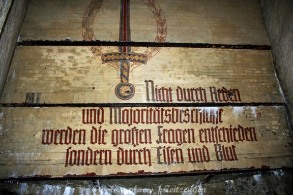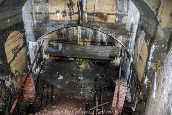 Viele wissen gar nicht, dass hier überhaupt ein Bunker ist. Von außen ist auch überhaupt nichts zu sehen. Ursprünglich war hier nämlich kein Bunker. Dieser wurde erst in den Kriegsjahren 1939 bis 1941 in einem bestehenden Hohlraum zu Luftschutzräumen für bis zu 950 Personen errichtet. Er war damals für Passanten und direkte Anwohner im Umfeld vorgesehen. Mit rund 2000 Tonnen Beton zog man Zwischendecken und Trennwände in den Hohlraum. Acht wabenähnliche Räume entstanden so. Mehrere Treppen führten in die unteren Ebenen der Schutzräume. Nach 1941 wurde in der Kegelspitze des Rundraums ein goldenes Hakenkreuz angebracht. An der Wand ist ein riesiger Adler gemalt, der in seinen Klauen einen Eichenkranz trägt. Im Inneren dieses Kranzes befand sich ein Hakenkreuz, welches jedoch mittlerweile übermalt wurde. Außerdem befinden sich im Innenraum noch weitere Wandmalereien, darunter Wappen und ein Hakenkreuz als Sonnenrad ( Schwarze Sonne) sowie – aus dem Zusammenhang gerissene – Zitate von einer ehemaligen politischen Größe.