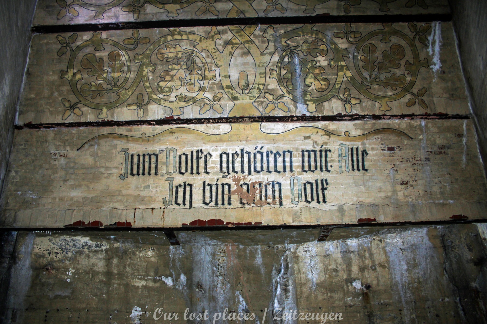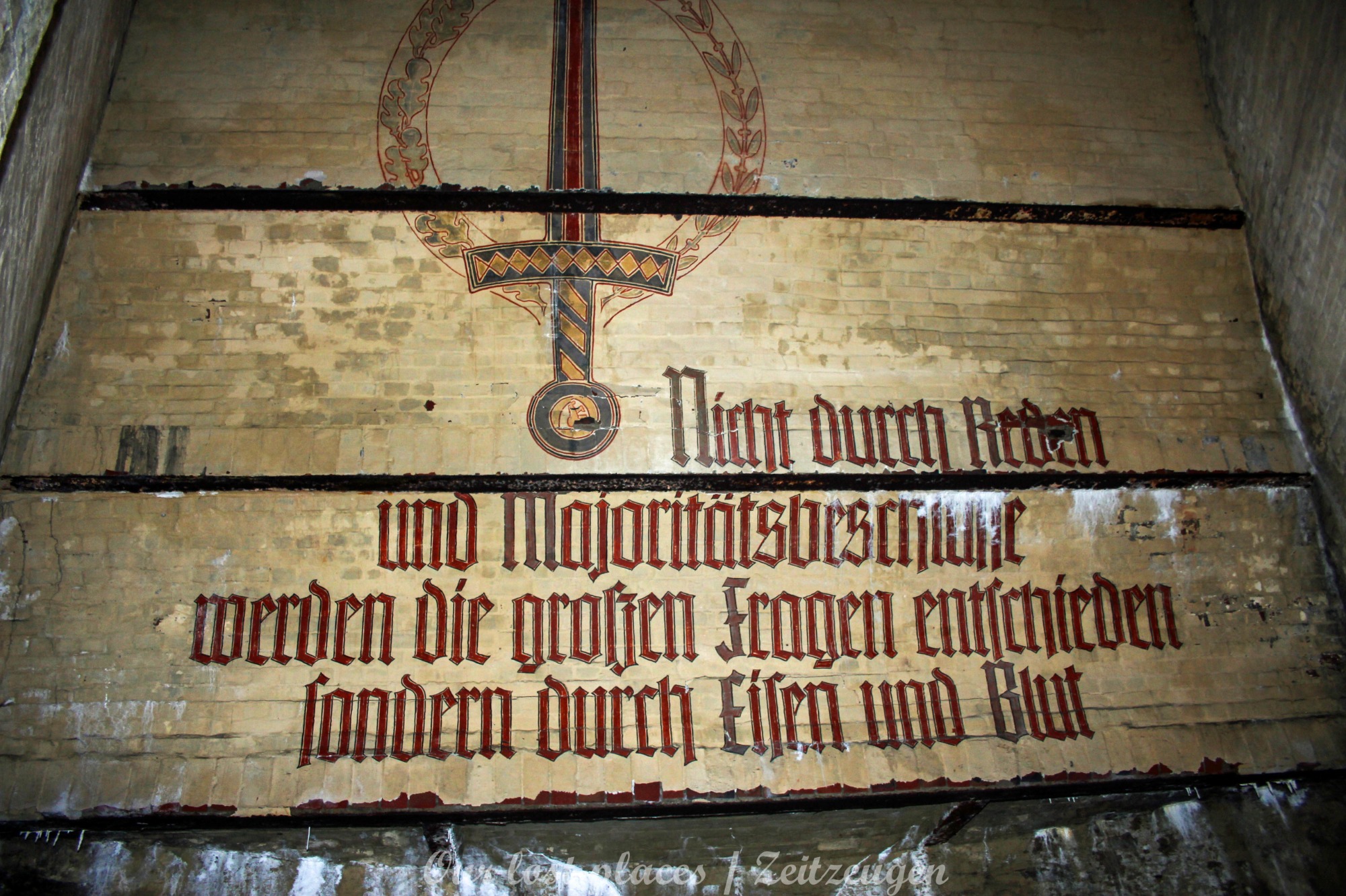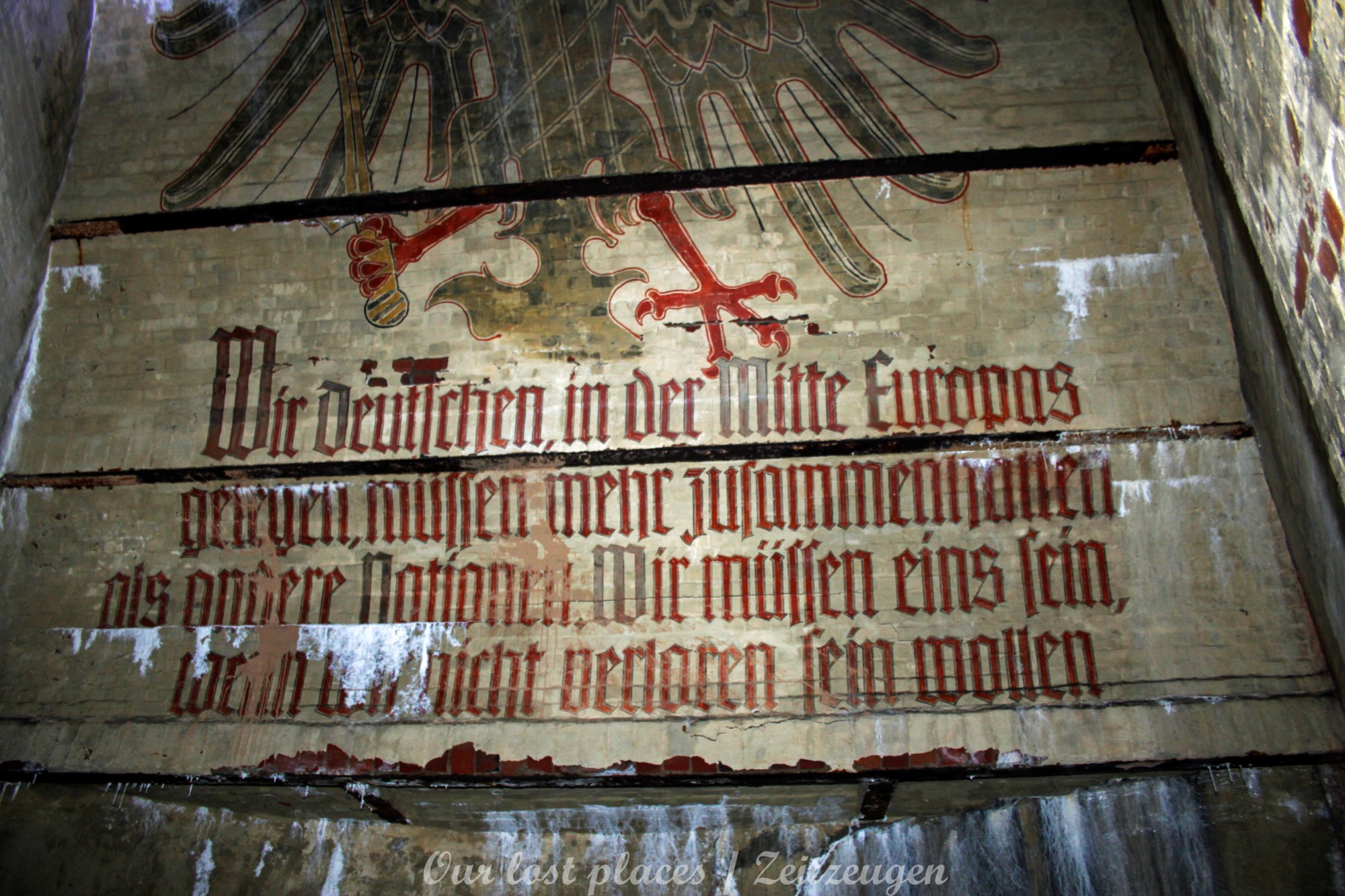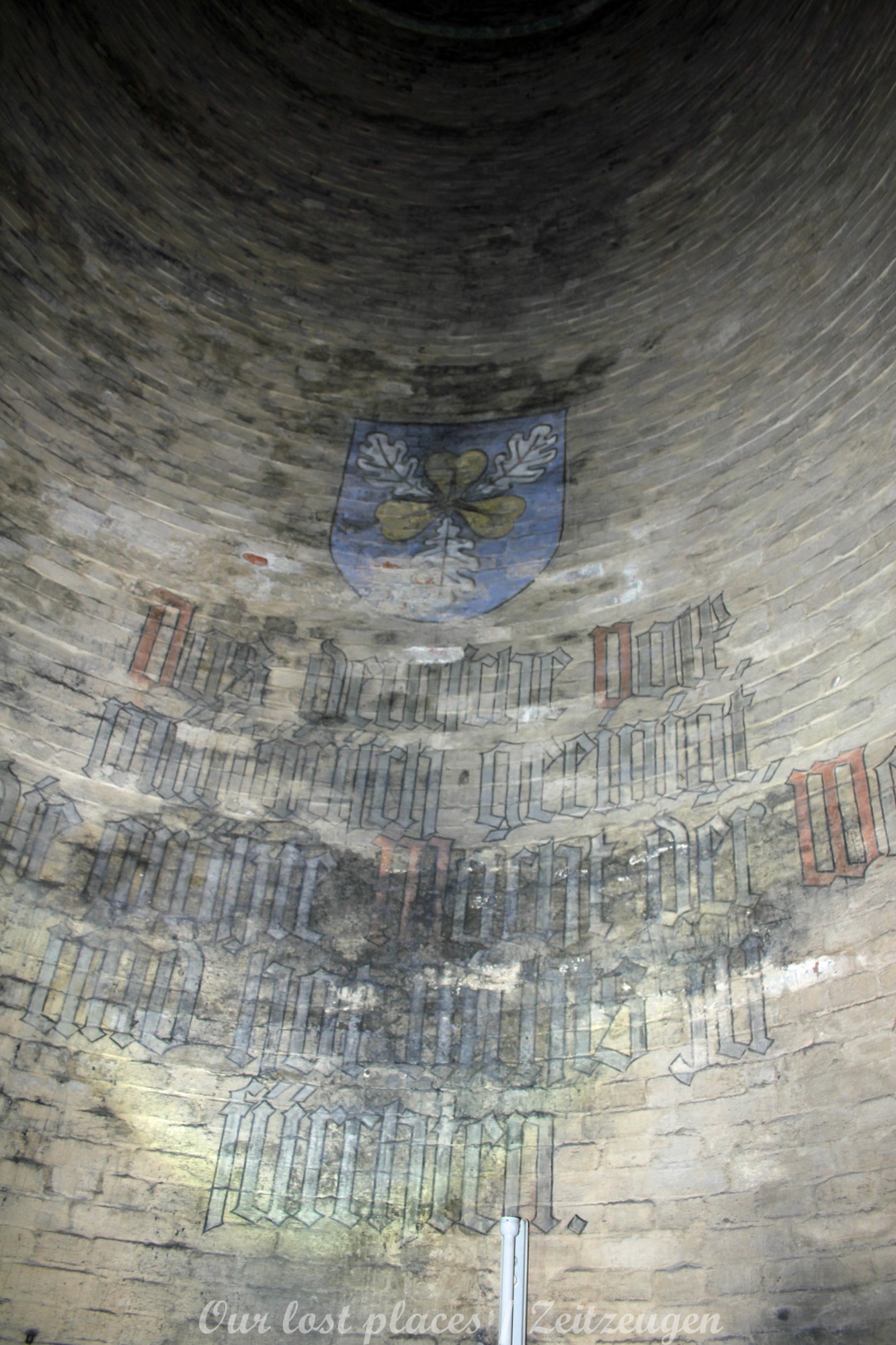 Viele wissen gar nicht, dass hier überhaupt ein Bunker ist. Von außen ist auch überhaupt nichts zu sehen. Ursprünglich war hier nämlich kein Bunker. Dieser wurde erst in den Kriegsjahren 1939 bis 1941 in einem bestehenden Hohlraum zu Luftschutzräumen für bis zu 950 Personen errichtet. Er war damals für Passanten und direkte Anwohner im Umfeld vorgesehen. Mit rund 2000 Tonnen Beton zog man Zwischendecken und Trennwände in den Hohlraum. Acht wabenähnliche Räume entstanden so. Mehrere Treppen führten in die unteren Ebenen der Schutzräume. Nach 1941 wurde in der Kegelspitze des Rundraums ein goldenes Hakenkreuz angebracht. An der Wand ist ein riesiger Adler gemalt, der in seinen Klauen einen Eichenkranz trägt. Im Inneren dieses Kranzes befand sich ein Hakenkreuz, welches jedoch mittlerweile übermalt wurde. Außerdem befinden sich im Innenraum noch weitere Wandmalereien, darunter Wappen und ein Hakenkreuz als Sonnenrad ( Schwarze Sonne) sowie – aus dem Zusammenhang gerissene – Zitate von einer ehemaligen politischen Größe.