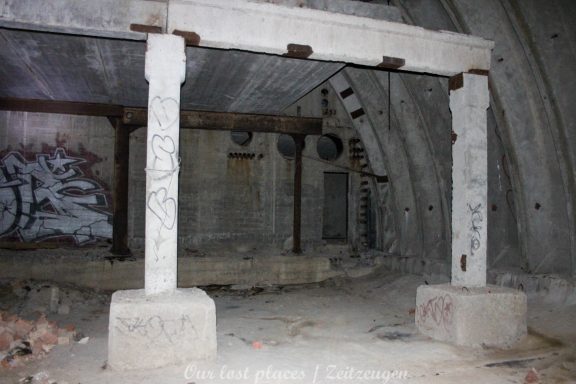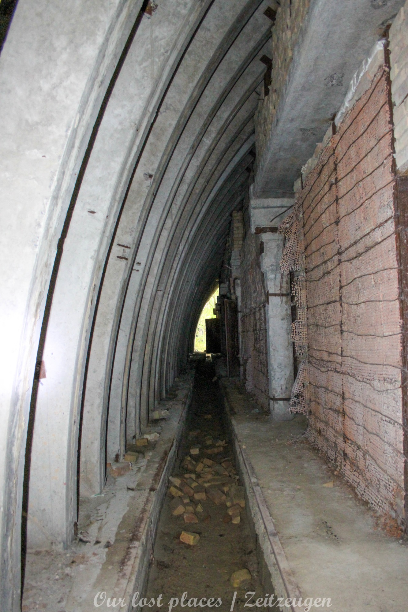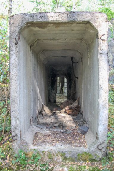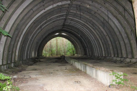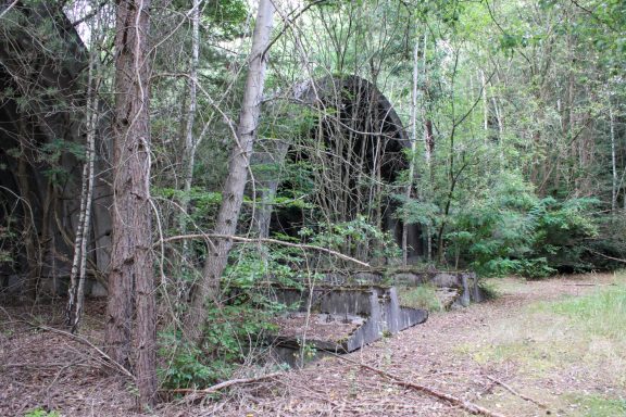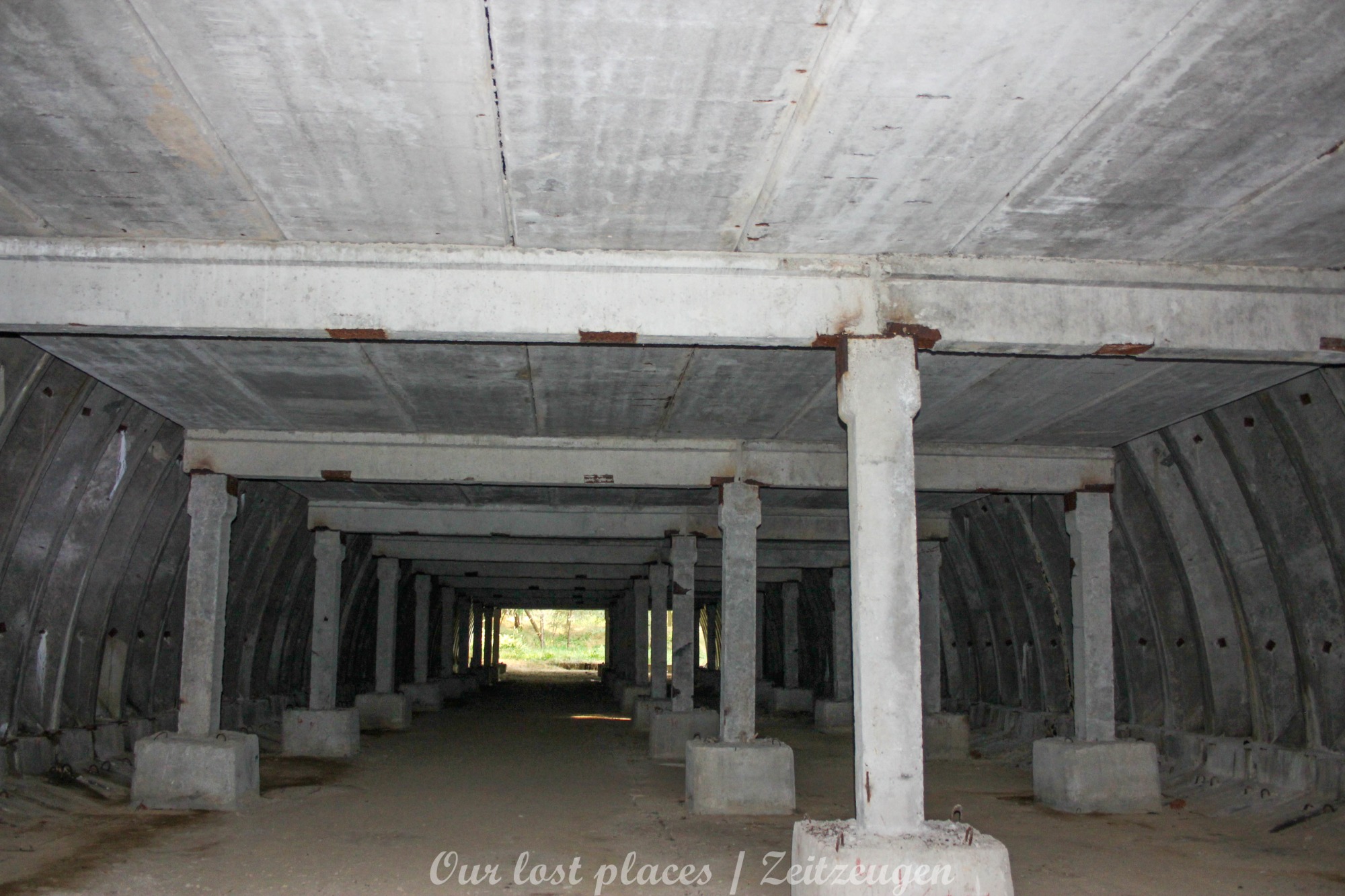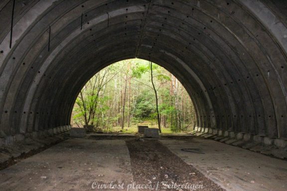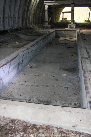 4 Bogendeckungen sind praktisch wie ein „H“ verbunden. Während 6 Anlagen sich schon etwas weiter im Bauzustand, aber noch nicht fertig befanden, war das 7 Gebäude noch wirklich absoluter Rohbau. Im Umfeld lagen auch noch weitere Fertigbetonteile, die vielleicht noch zu einer weiteren Bogendeckung dienten. Wir wissen es nicht. Bei einigen Objekten war die Ziegelsteinauflage schon vorhanden. Auch die inneren Öffnungen für Strom- und andere Versorgungen war schon gesetzt. Eine Bogeneinheit war im unteren Bereich schon komplett ausgemauert, um einzelne Räume zu erstellen. In zwei weiteren stehen im inneren Stahlbetonskelett um das Objekt über zwei Etagen zu nutzen. In einigen Bereichen kann man erkenne, dass hier Aggregate geplant waren. Geplant war auch eine Erdüberdeckung. Dies erklärte dann auch die dicke Teerschicht auf den Bögen. Dazu ist es jedoch nicht mehr gekommen. Um die Anlage herum kann man noch Drainageschächte aus Brunnenringen finden. Die Anlage selber ist im Vergleich zu vielen anderen noch in einem recht guten Zustand, da sie extrem abgelegen ist und somit kaum Vandalismus getätigt wurde.