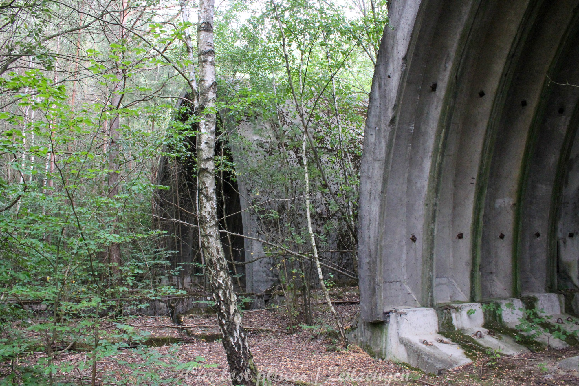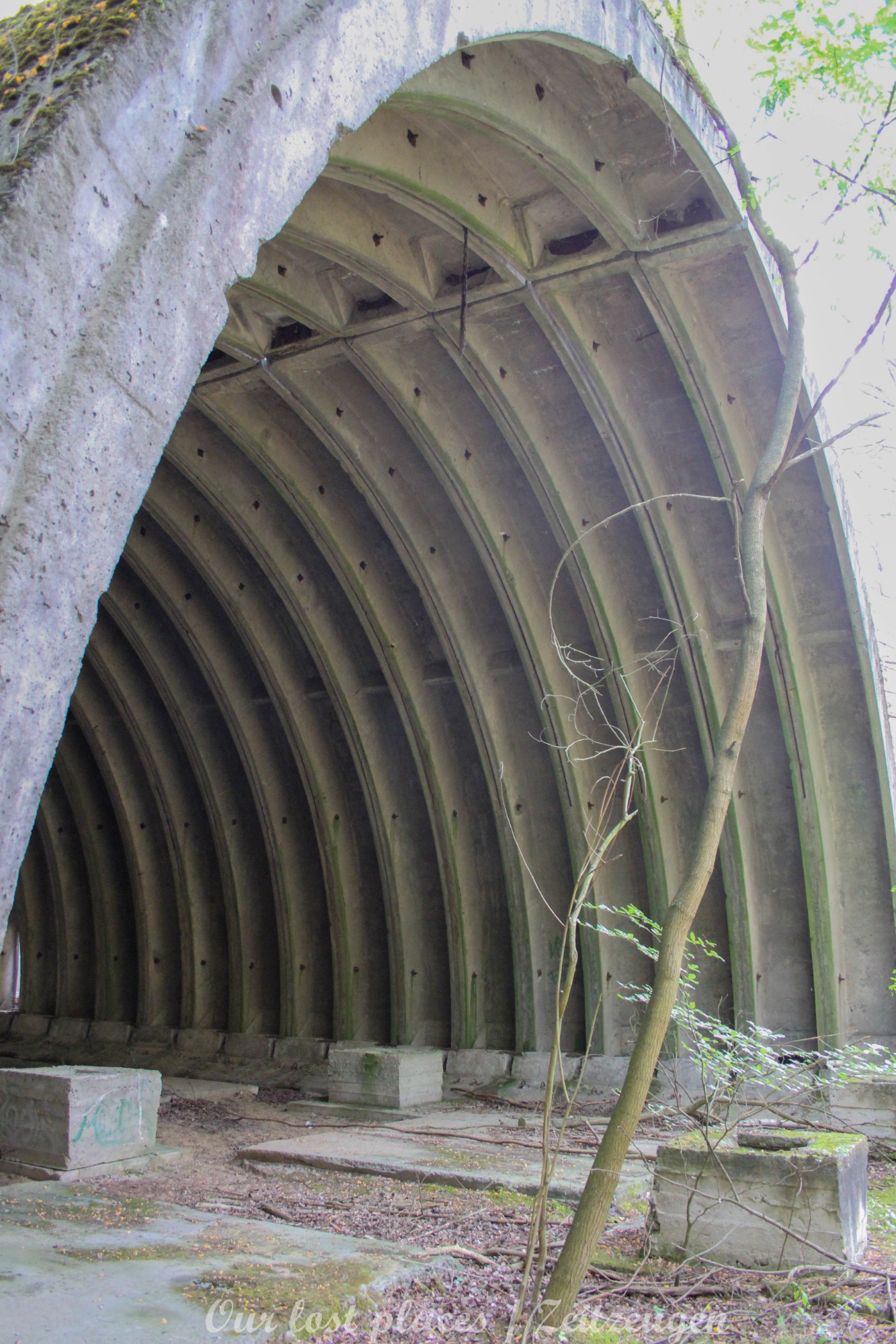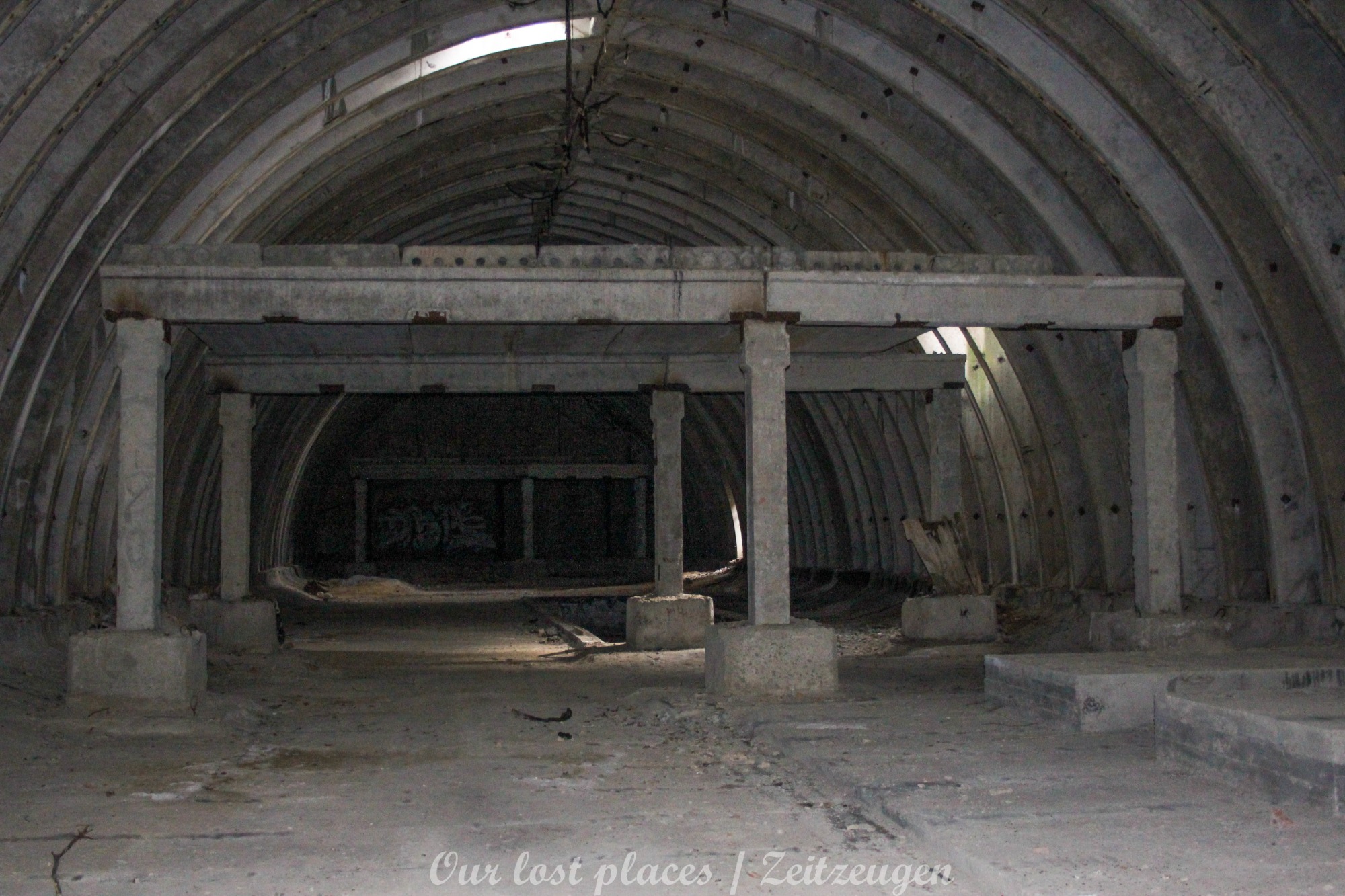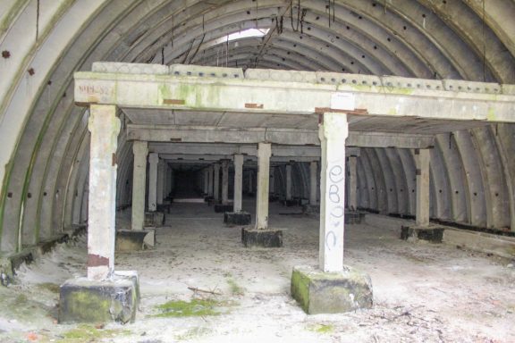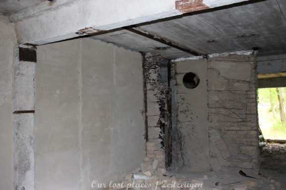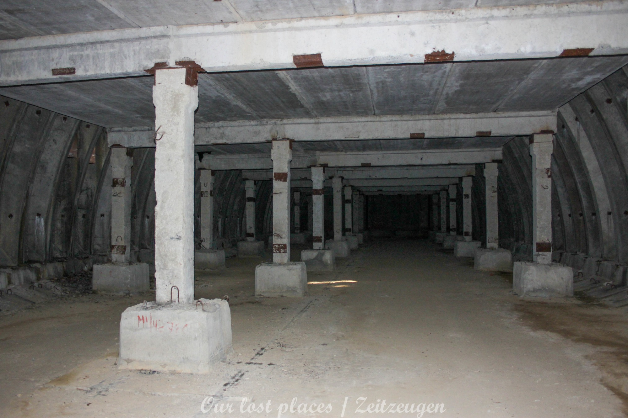 4 Bogendeckungen sind praktisch wie ein „H“ verbunden. Während 6 Anlagen sich schon etwas weiter im Bauzustand, aber noch nicht fertig befanden, war das 7 Gebäude noch wirklich absoluter Rohbau. Im Umfeld lagen auch noch weitere Fertigbetonteile, die vielleicht noch zu einer weiteren Bogendeckung dienten. Wir wissen es nicht. Bei einigen Objekten war die Ziegelsteinauflage schon vorhanden. Auch die inneren Öffnungen für Strom- und andere Versorgungen war schon gesetzt. Eine Bogeneinheit war im unteren Bereich schon komplett ausgemauert, um einzelne Räume zu erstellen. In zwei weiteren stehen im inneren Stahlbetonskelett um das Objekt über zwei Etagen zu nutzen. In einigen Bereichen kann man erkenne, dass hier Aggregate geplant waren. Geplant war auch eine Erdüberdeckung. Dies erklärte dann auch die dicke Teerschicht auf den Bögen. Dazu ist es jedoch nicht mehr gekommen. Um die Anlage herum kann man noch Drainageschächte aus Brunnenringen finden. Die Anlage selber ist im Vergleich zu vielen anderen noch in einem recht guten Zustand, da sie extrem abgelegen ist und somit kaum Vandalismus getätigt wurde.