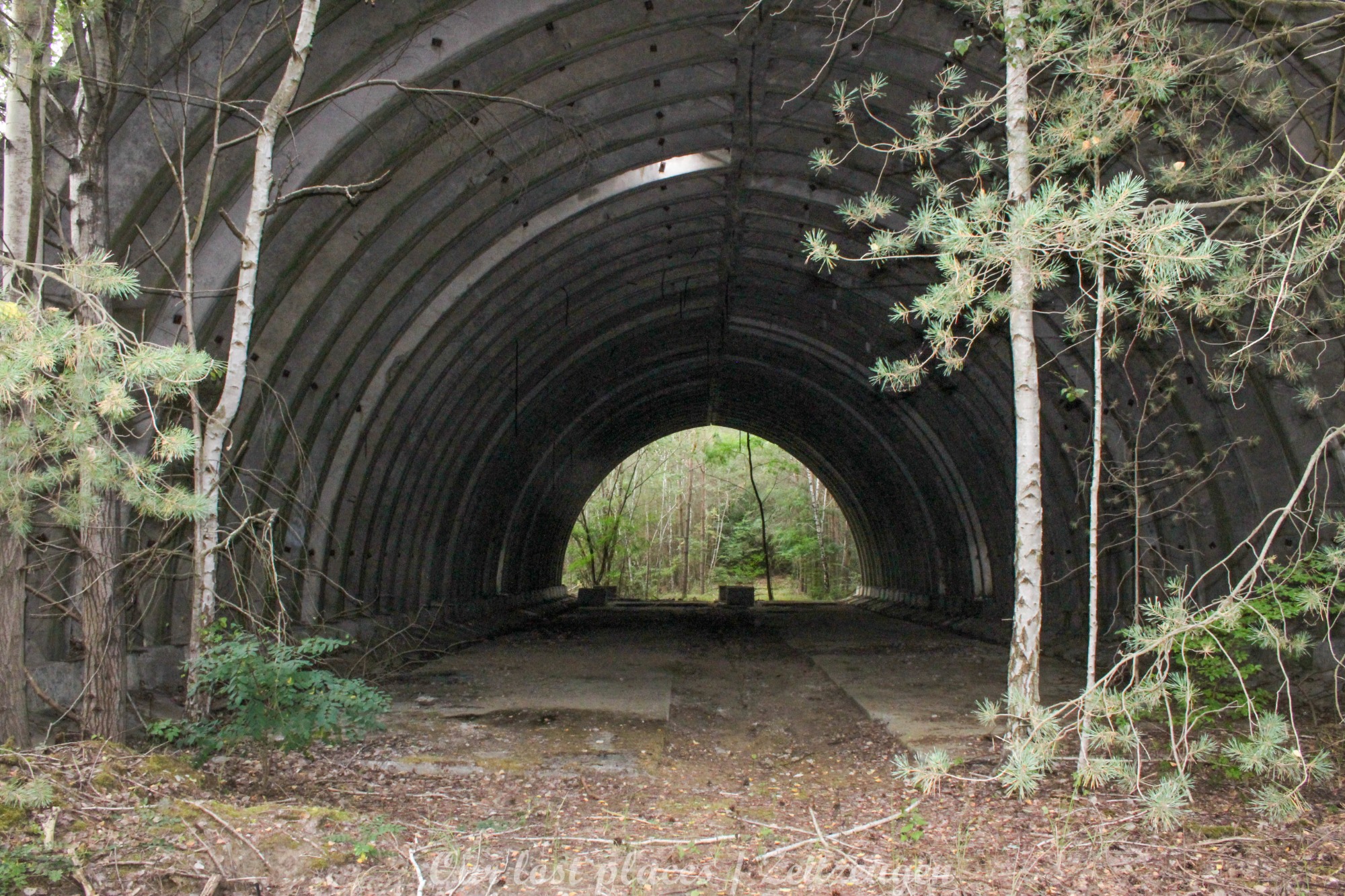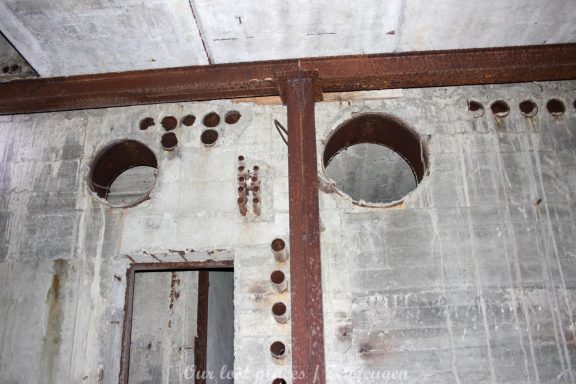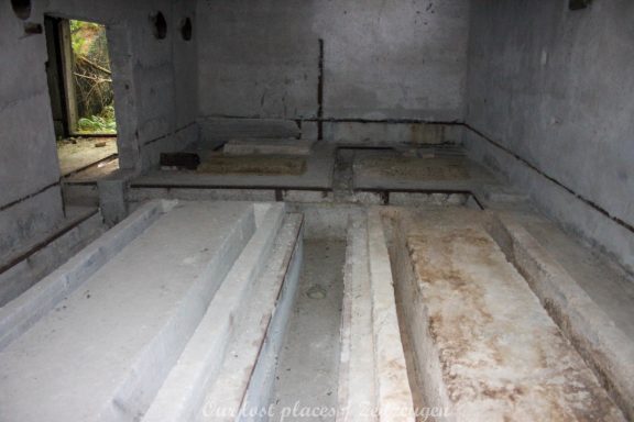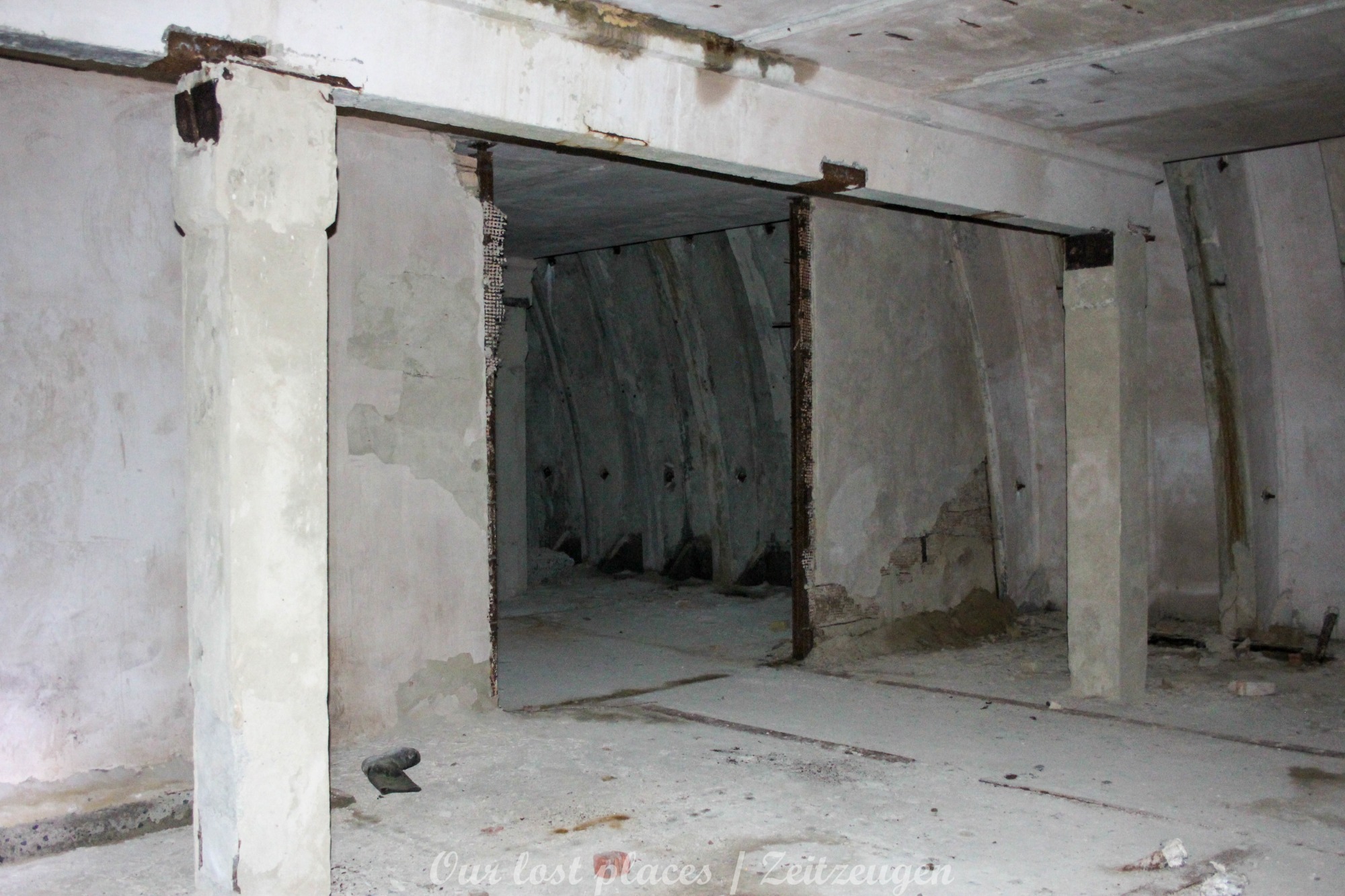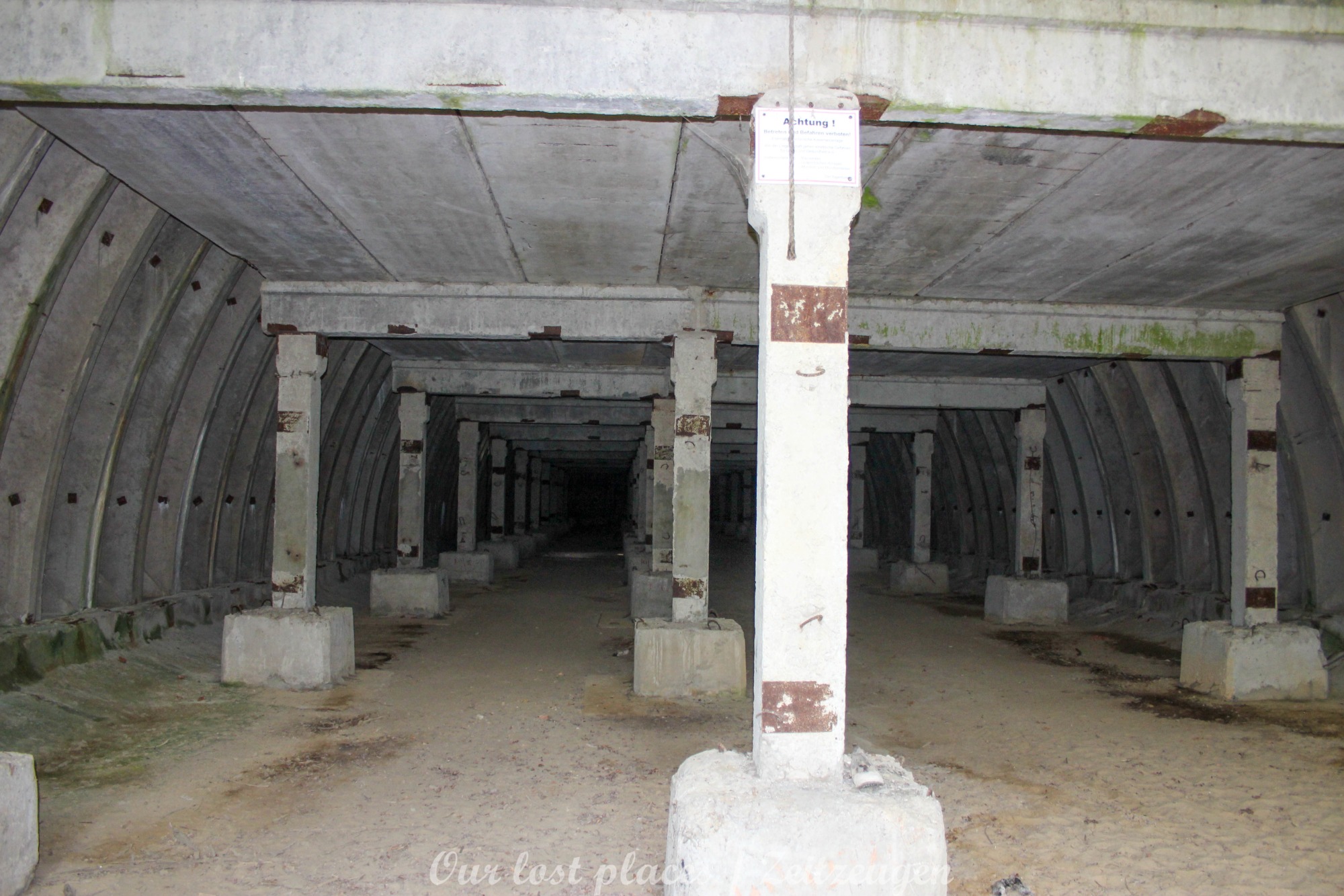 4 Bogendeckungen sind praktisch wie ein „H“ verbunden. Während 6 Anlagen sich schon etwas weiter im Bauzustand, aber noch nicht fertig befanden, war das 7 Gebäude noch wirklich absoluter Rohbau. Im Umfeld lagen auch noch weitere Fertigbetonteile, die vielleicht noch zu einer weiteren Bogendeckung dienten. Wir wissen es nicht. Bei einigen Objekten war die Ziegelsteinauflage schon vorhanden. Auch die inneren Öffnungen für Strom- und andere Versorgungen war schon gesetzt. Eine Bogeneinheit war im unteren Bereich schon komplett ausgemauert, um einzelne Räume zu erstellen. In zwei weiteren stehen im inneren Stahlbetonskelett um das Objekt über zwei Etagen zu nutzen. In einigen Bereichen kann man erkenne, dass hier Aggregate geplant waren. Geplant war auch eine Erdüberdeckung. Dies erklärte dann auch die dicke Teerschicht auf den Bögen. Dazu ist es jedoch nicht mehr gekommen. Um die Anlage herum kann man noch Drainageschächte aus Brunnenringen finden. Die Anlage selber ist im Vergleich zu vielen anderen noch in einem recht guten Zustand, da sie extrem abgelegen ist und somit kaum Vandalismus getätigt wurde.